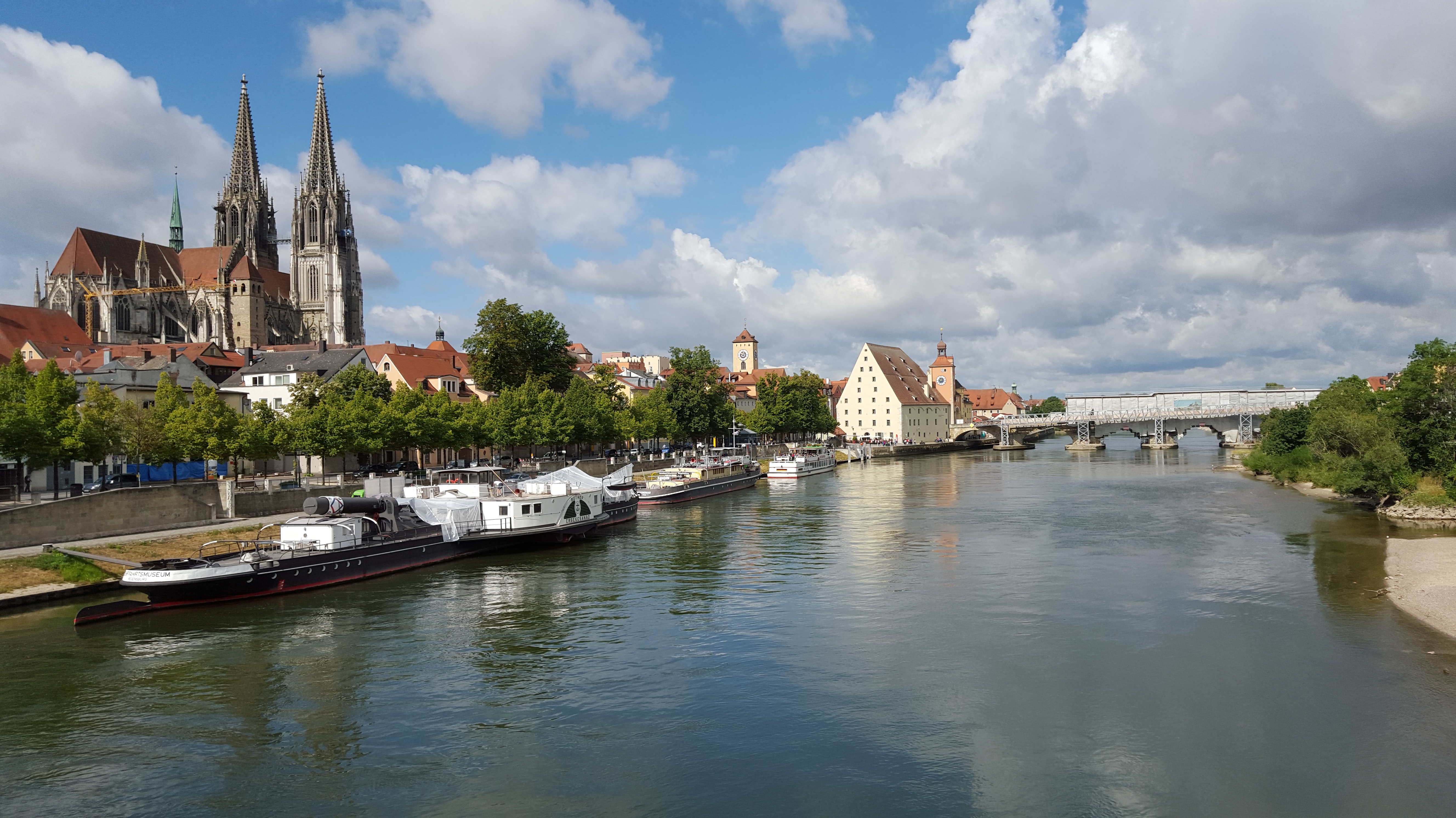 . We can now watch barges going along the river along with many other watercraft. We are spending the day in Regensburg, said to be one of the best preserved medieval cities in Europe. It has many narrow winding streets