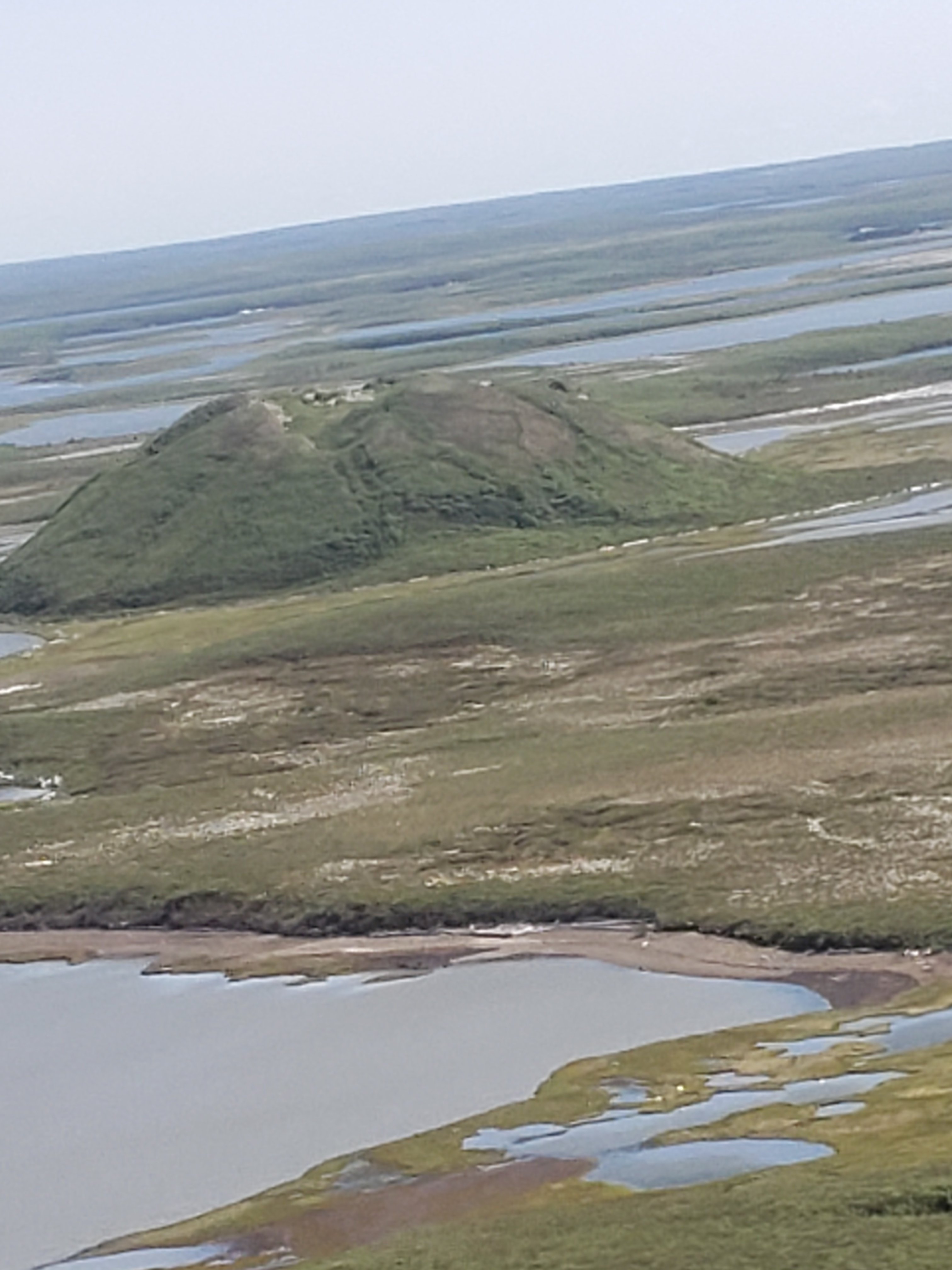 Wow, it was quite a ride. Endless tundra and skies. Tough road (little did we know that this was the “good section”) but quite beautiful. After our return, we began to meet our fellow riders and crew. There are nearly 40 people including staff on this section from many countries including the UK, the Netherlands, Germany, Slovenia, Namibia, South Africa, Australia, New Zealand, Canada, the US, and Brazil all with the goal of crossing this amazing land on two wheels. We first traveled up to Tuktoyaktuk, a village on the Arctic ocean where the ride was to begin. We camped on a point overlooking the Arctic Ocean. The local take out place, Grandma’s kitchen, offers Beluga bites and Muskox burgers on the menu. We could also see pingos, isolated hills in the permafrost that are made from collections of underground ice that push the land up like cold volcanoes. It was sobering to learn about the impact of climate change here. The permafrost is melting and the ice shelf that used to be visible from Tuktoyaktuk at this time of year is now about 50 miles away