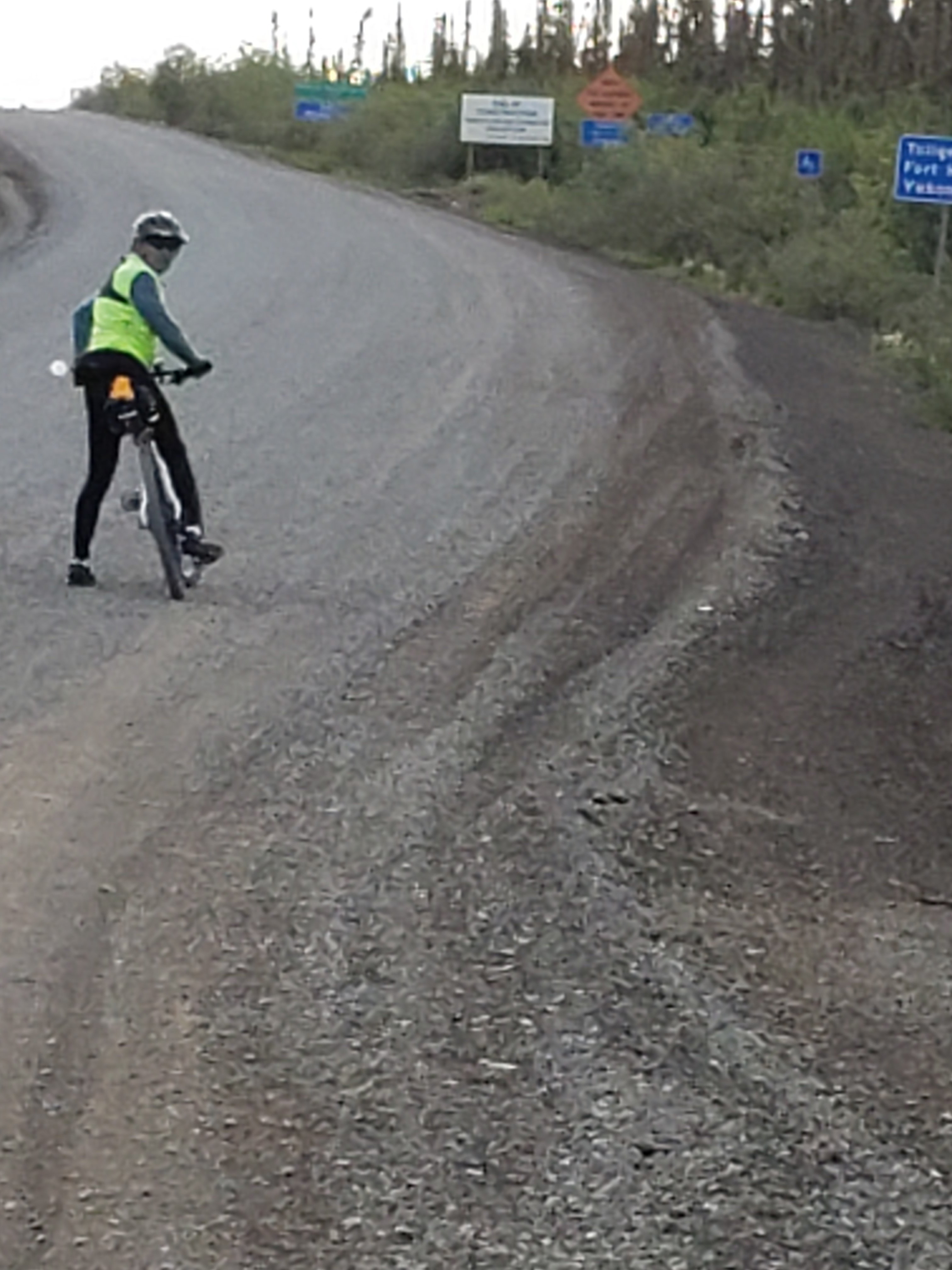 On July 4th we started off on our southward journey.The road was rougher han we had imagined: deep gravel, mud, big winds. At one point slogging up a steep grade against a surge headwind up a steep grade I was definitely questioning our sanity. 95 miles the first day took us 10 1/2 hours in the saddle ( ouch!). We made it albeit as the last of the riders who road the whole way that day!! Yahoo! Back in Inuvik for the night, tomorrow we continue south after some much needed rest with an eye mask since it is as bright as midday at 11pm when we finally closed our eyes.
