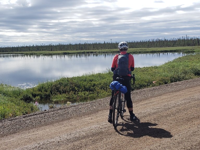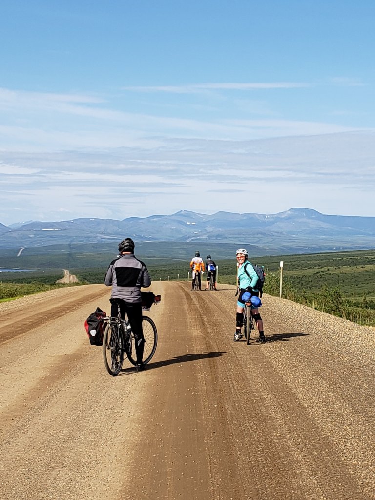 Luckily the rain has come mainly at night when we are snug in our cozy tent. The road conditions however have ranged from mud to dry and dusty, relatively smooth and hard-packed to loose, bumpy, challenging gravel. Sometimes I have to stop and chip the cement-like mud off the fork of my bike frame so that the wheel will continue to turn. Jim has already had four flat tires and Debbie our riding buddy has had one. Jim is out of spare tubes so we will have to go shopping when we hit Dawson City, the next town several hundred miles from Inuvik. The scenery has varied from treeless permafrost tundra to scrubby stunted black fir forest to majestic vistas.