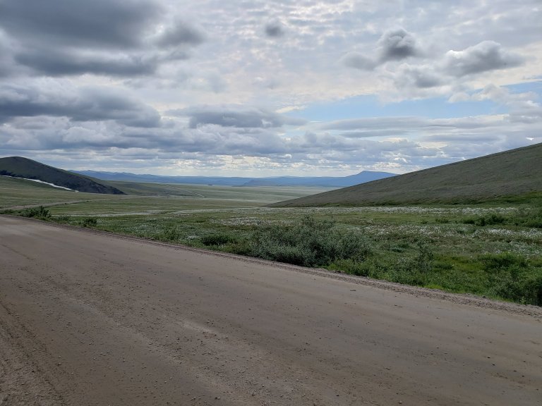 We are riding the Dempster Highway, the only road in this remote region linking the Yukon with a portion of the Northwest Territories. It is a rough gravel road that is open when the road quality is good enough. For about a month in the spring it is closed for “spring thaw” as well as a month in the fall for “freeze up” since there a a couple of river crossings by ferry in the summer and by ice road in the winter.