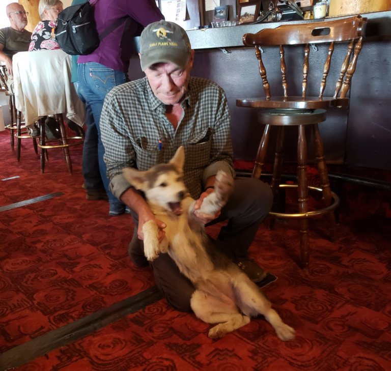 Stan, pictured above with River, his 4 month old Husky/Malamute puppy, is the owner of Eagle Plains. He offered up a wealth of information about life in the middle of the Yukon. For example, the “Dempster Post” is an informal system to get packages of supplies and food to travelers on the road like solo distance cyclists who can’t carry everything that they need. They leave the supplies at the desk of the hotel with a destination up the road and a date needed. Then a traveler with a motorized vehicle agrees to carry it up the road and hand it off to that bicyclist. Well, time to hit the hay. Will send this off at the next point of civilization. Bye for now.