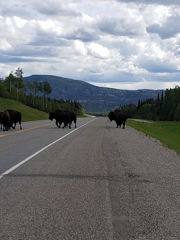Believe those were ‘wood bison’ you encountered – also found in Yellowstone. Rut goes from July thru September, so the pickup assisting may have been dang helpful.