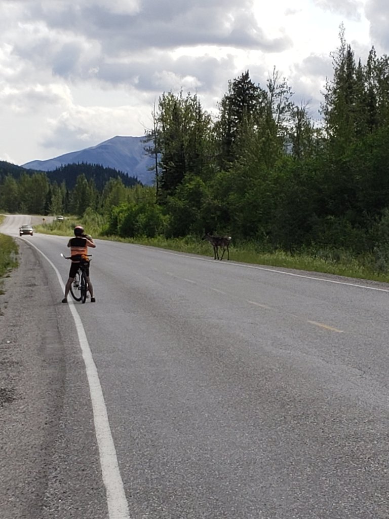 The bison were plentiful near Muncho Lake. I confess that I have always thought of bison as grassland or prairie animals. Here they live in the woods but wander down to the roadside to graze. This small herd had numerous calves. They were all quite placid when a pickup truck drove by and then pulled over to watch them. Their response to us on our bikes was less accepting. I guess they are fairly accustomed to cars/ trucks but we must have seemed like predators. As we rode up, they began to run and the big bull with them came up on the road to show us his displeasure at our intrusion. Fortunately for us, the friendly couple in the pickup truck slowly drove beside us in front of the big guy to keep us out of harm’s way.