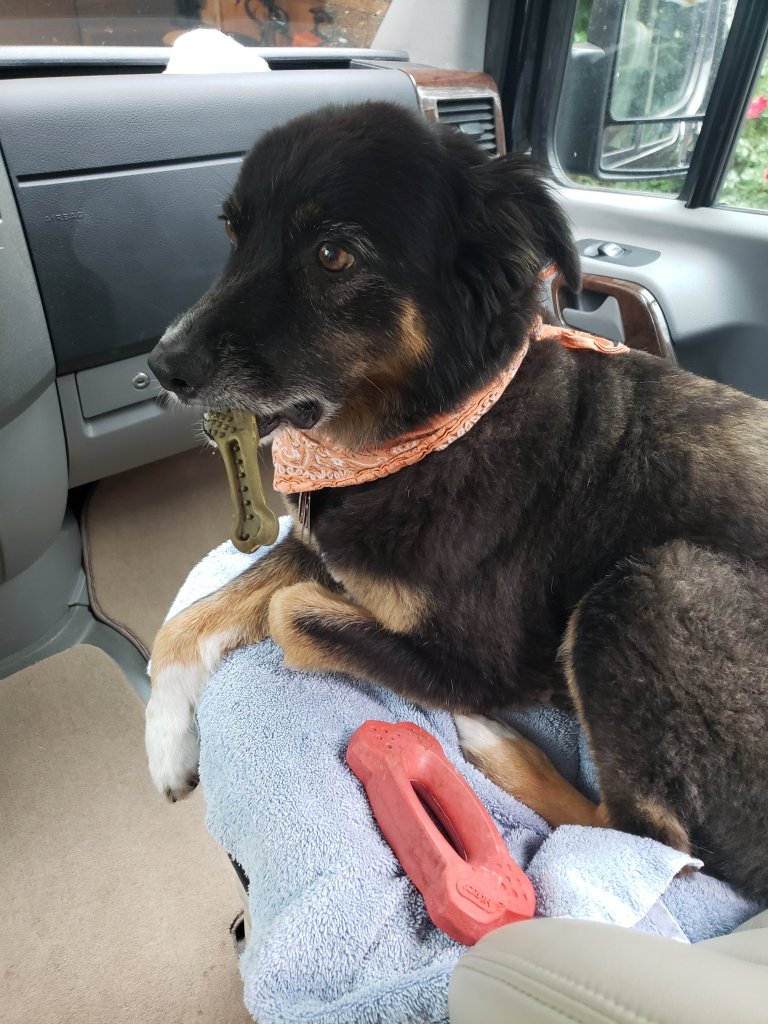 Star is less thrilled. For unknown reasons she has developed van travel anxiety and pants and shakes and fusses on the road. Silly girl! We are trying a vet- recommended pheromone spray on a bandana around her neck to calm her. Supposedly it smells like momma dogs and is calming. If it doesn’t help, at least she looks like a cute little cowgirl…quite appropriate for this sojourn.