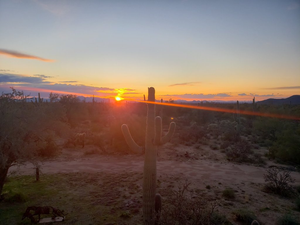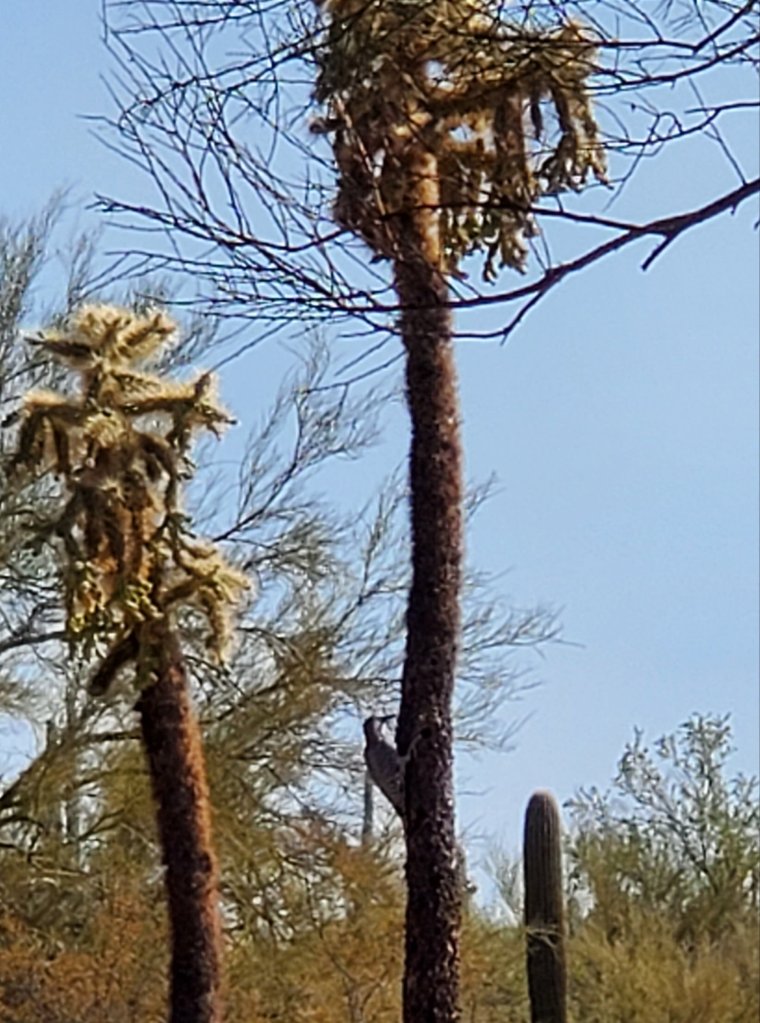 We’re back in our desert abode and pretty much finished with the tasks of cleaning up and settling in. Sadly this area is in the throes of a severe drought and hotter than normal temperatures. You might think that is normal for the Sonoran Desert but there are usually 2 rainy seasons: the monsoons in July-August and a second rainy period in December-January. The monsoons never arrived this summer and the temperatures even now are routinely in the high 90Β°sF (that’s 35-37Β°C). We are hoping for rain but it is amazing to see how the native vegetation hunkers down and hangs on: the saguaro cacti get “skinny”, the native trees like mesquite and ironwood look unperturbed, the bushes like the bursage drop their leaves and wait. Jim and I put out birdseed and water and are inundated with birds: gila woodpeckers, finches, curved-bill thrashers, brilliant red cardinals, mourning doves. They’re no dummies…the word travels fast about a free lunch!