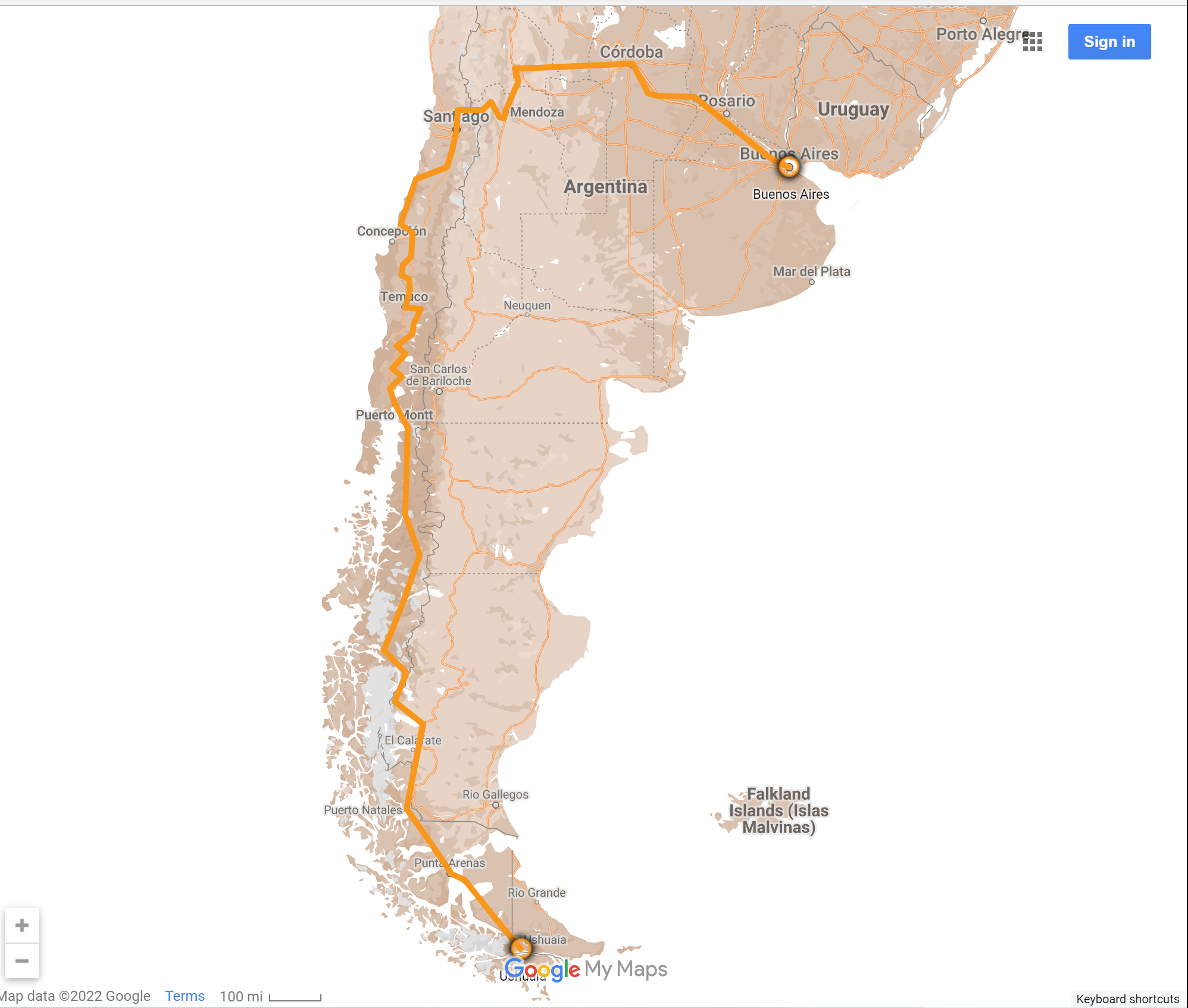 Aging is funny. Its a bit like having an old vehicle that you’re not sure you can trust on another long road trip. One day you think it’s time to accept that you’re getting old and to acknowledge the limitations of your aging body. Then denial and wanderlust set in. The next thing you know, you are headed off on a new bicycle tour adventure! Yes folks, it’s true, Jim and I are headed off on our bikes once again. This time we’re headed off to South America. Inspired by Deb, our good friend and companion from other bicycling adventures, we have signed up for the TDAglobal cycling South American Epic 2022. Jim plans to ride the first section from Buenos Aires, Argentina to Santiago, Chile. He is then graciously heading home to be with Star, our aging and beloved Australian Shephard of 13+ years. I hope to continue on south through the Lake District of Chile and through Patagonia (Chile and Argentina) to Ushuaia near the southern tip of South America.