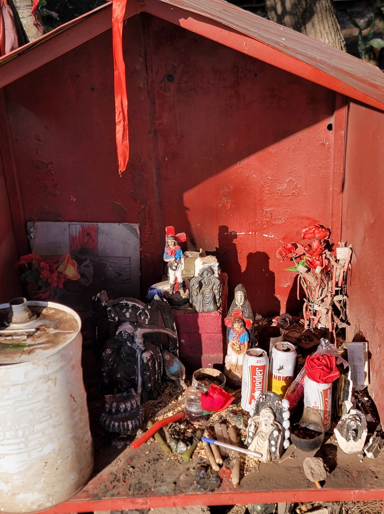 His shrines are everywhere and there are offerings of wine, beer, flowers, food and thank you notes left at each one. They are always red and have one or many images.