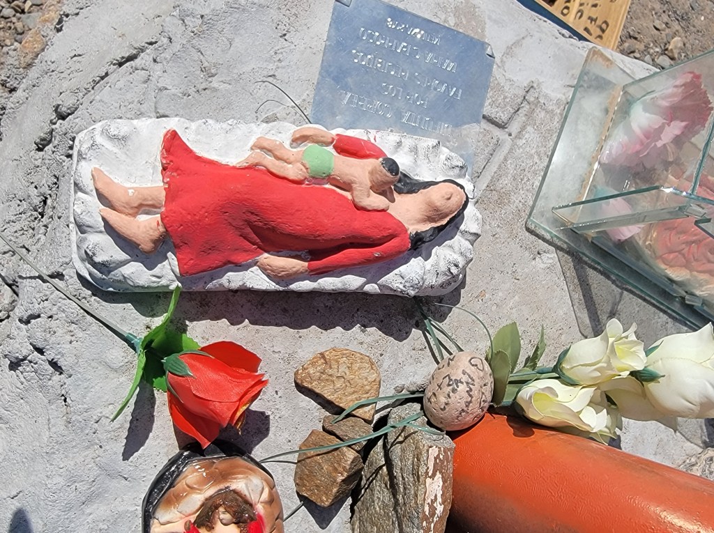 Another saint that we have seen many shrines for is Difunta Correa meaning the deceased Correa. The legend of the Difunta is that her husband was forcibly taken into the army in 1840 and then abandoned when he became ill. To try to reach him, she took her baby and set off across the desert. Regrettably she died of exposure and dehydration. Days later she was found by gauchos driving their cattle. Miraculously, her baby was found alive still nursing at her “ever-full” breast. We stopped by her major shrine in the village of Vallecito where thousands make pilgrimage every year. Her shrines always include some sort of structure to give her shelter and usually many water bottles.