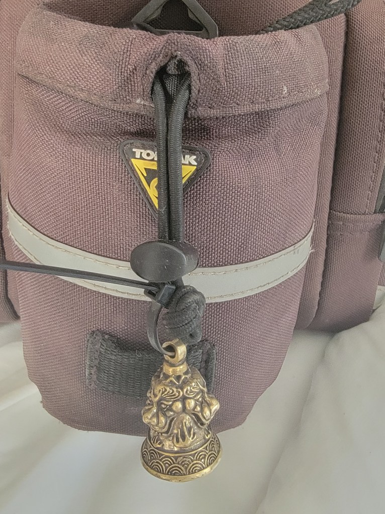 Jim and I have our own superstitions. Our good friend Richard gave us each a “gremlin bell” for the journey. This lovely little bell tinkles away on our bike bags, keeping away gremlins, scissors in the road, and all other sorts of ills and bad luck. Thank you Richard! They are working well thus far!