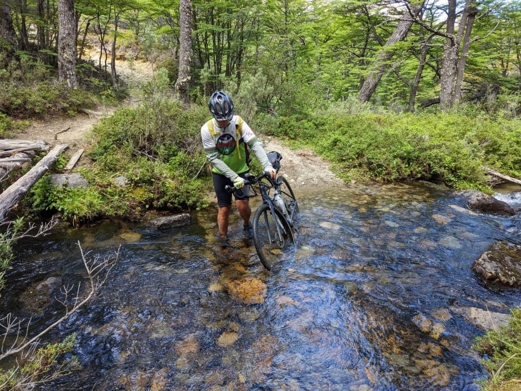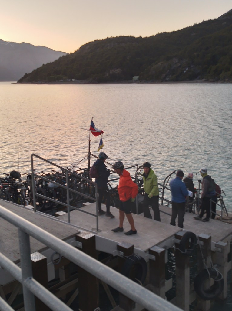 The crossing involved a quick ride to the ferry, a 2-4 hr ferry ride across the Lago (depending on which ferry you were on), then going through a remote Chilean border crossing on a strip of land that we need to cross to exit Chile. This was quite a slow process. Once through each rider had to go 20 km on stèep, rough gravel, gravel road and then very tough single track full of tree roots, downed trees, and streams to ford. Challenging for experienced mountain bikers, only walkable by me. It involved countless times of getting on and off the bike and lifting it over impassable obstacles.