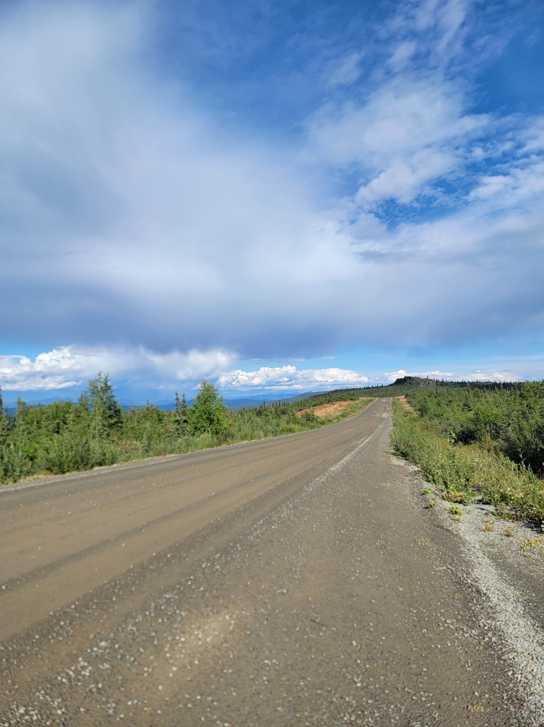 The other destination that I didn’t want to miss is just down the road: The Top of the World Highway. How could you fail to want to see it!? Reading more I found that it is considered one of the most scenic drives in North America. It starts at the border crossing into Canada and winds its way somewhat precariously to Dawson City in the Yukon. The road is generally gravel and in places is quite narrow with steep drop-offs and no guardrails. Amazingly large rv coaches take this route and there is scarcely enough room for two to pass each other. They made me nervous! Just a week or so ago the area was blanketed in smoke from wildfires. Fortunately for us, there has been rain and we had crisp clean air.