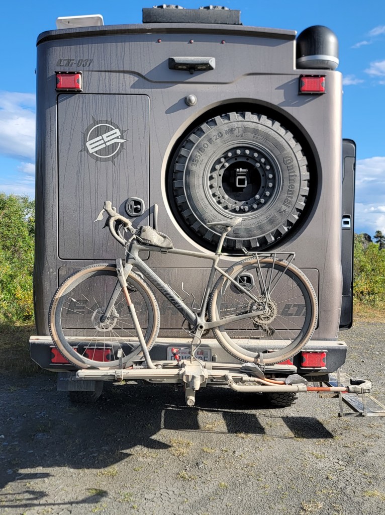 The road was dry further along and we were greeted by copious gravel dust. Eventually Jim’s bike on the back of the Truck took on a ghostly hue. We each cycled a short section today but got a real workout with the gravel on the hilly terrain.
