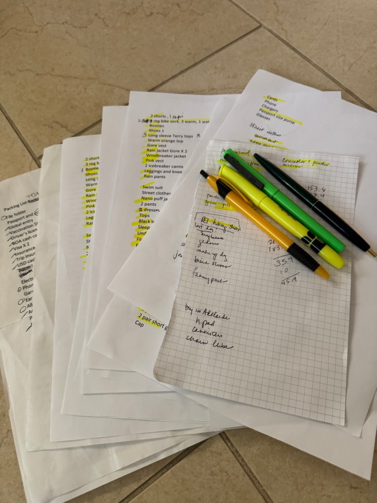 Packing. Since my memory is not as good as it once was, I rely on lists to keep track of my packing. One bag, nearly three months. Bike clothes for whatever weather we run into, street clothes for rest days and hiking, favorite toiletries to avoid needing to shop, electronics to keep track of the miles etc, etc all need to fit into one duffle bag.